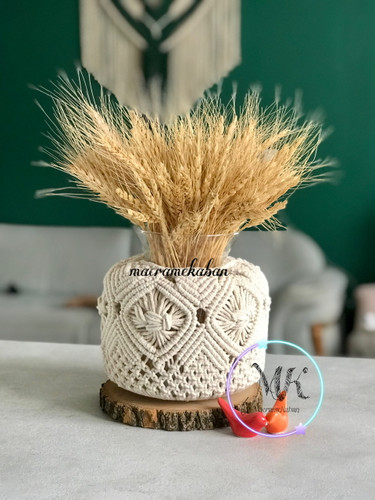 گلدون های شیشه ای با کاور مکرومه که هم به عنوان جاشمعی و هم به عنوان گلدان میشود از آنها استفاده کرد از بهترین دکورهای روی میز یا کنسول محسوب می شود . با قراردادن گل های طبیعی در داخل آن زیبایی میز یا کنسولتان را دو چندان می کنین کاور گلدان از نخ پلی استر و نخ پنبه کتان بافته شده است و کاملا قابل شستشو می باشند.